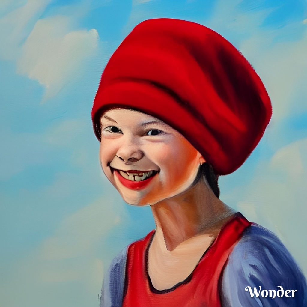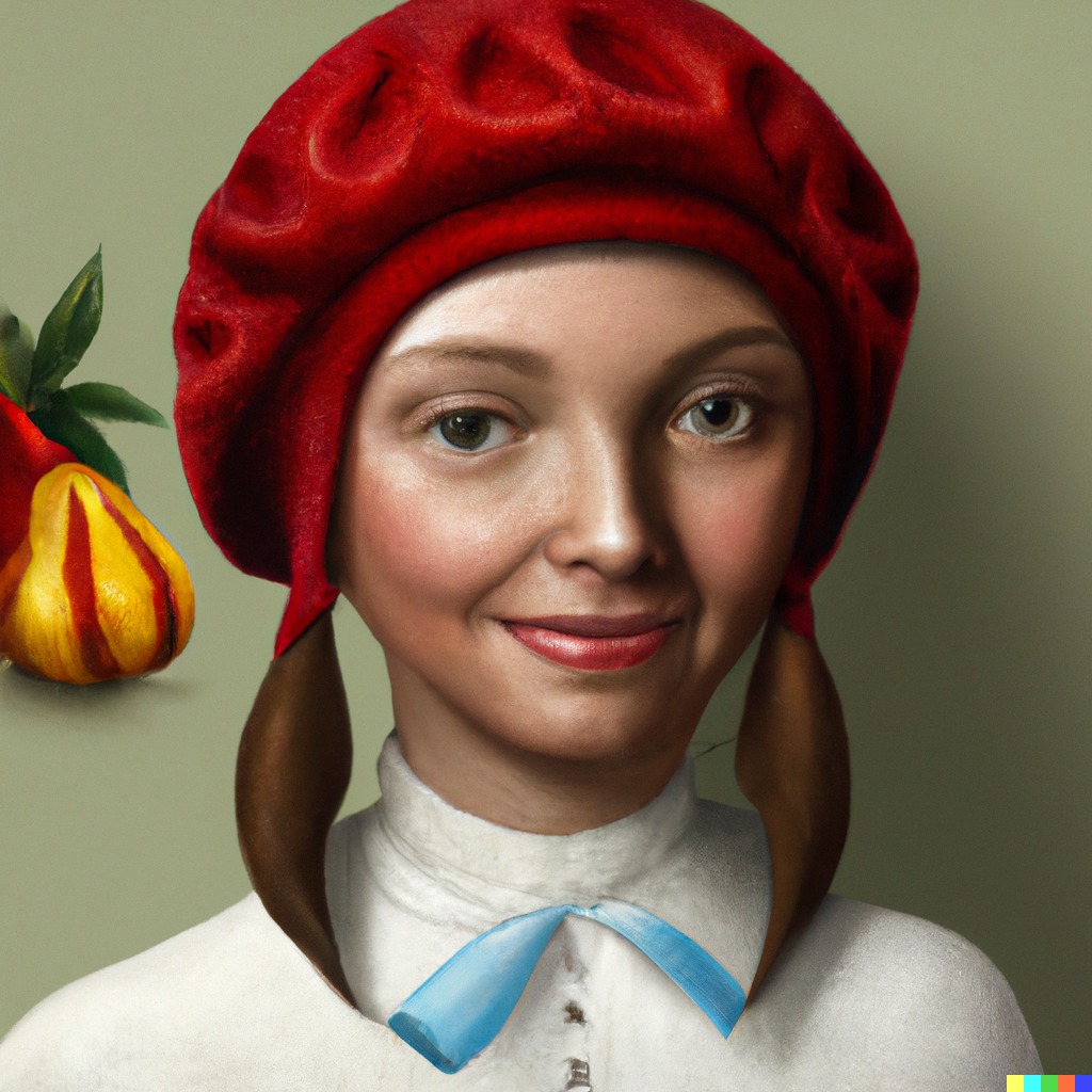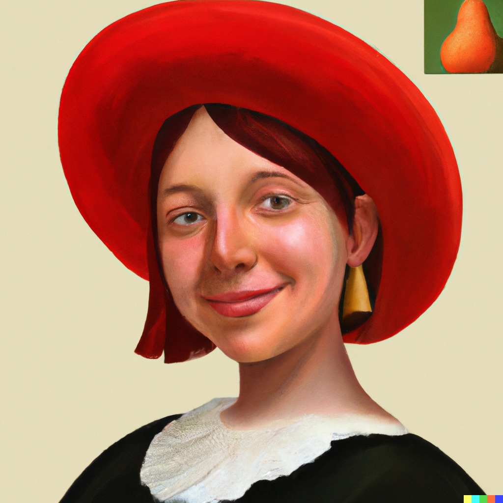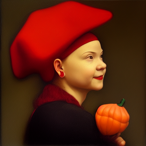 Zkusil jsem jako vstup obraz, co jsem před pár měsíci vygeneroval přes DALL-E – „Dívka s červenou čepičkou“. Tento model vytvořil prompt: „a painting of a woman wearing a red hat, inspired by Ambrosius Benson, behance contest winner, she is a gourd, greta thunberg smiling, dating app icon, 1970s female alive, two pointed ears, rosetti, daz3d, beets, okuda, ingres“.