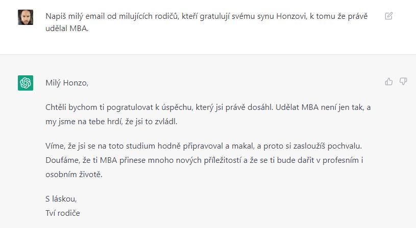 Pár ukázek chatGPT. Tento model patří do rodiny GPT-3.5 (ne 3 jak se často píše). Podobně jako InstructGPT je vylepšován posilovaným učením prostřednictvím lidské zpětné vazby. Všechny ukázky co vidíte jsou psány v českém jazyce (velké zlepšení). Očividně dokáže napsat například esej, nebo email. Občas si také celkem věrohodně vymýšlí (podobně jako GPT-3 nebo Galactica).