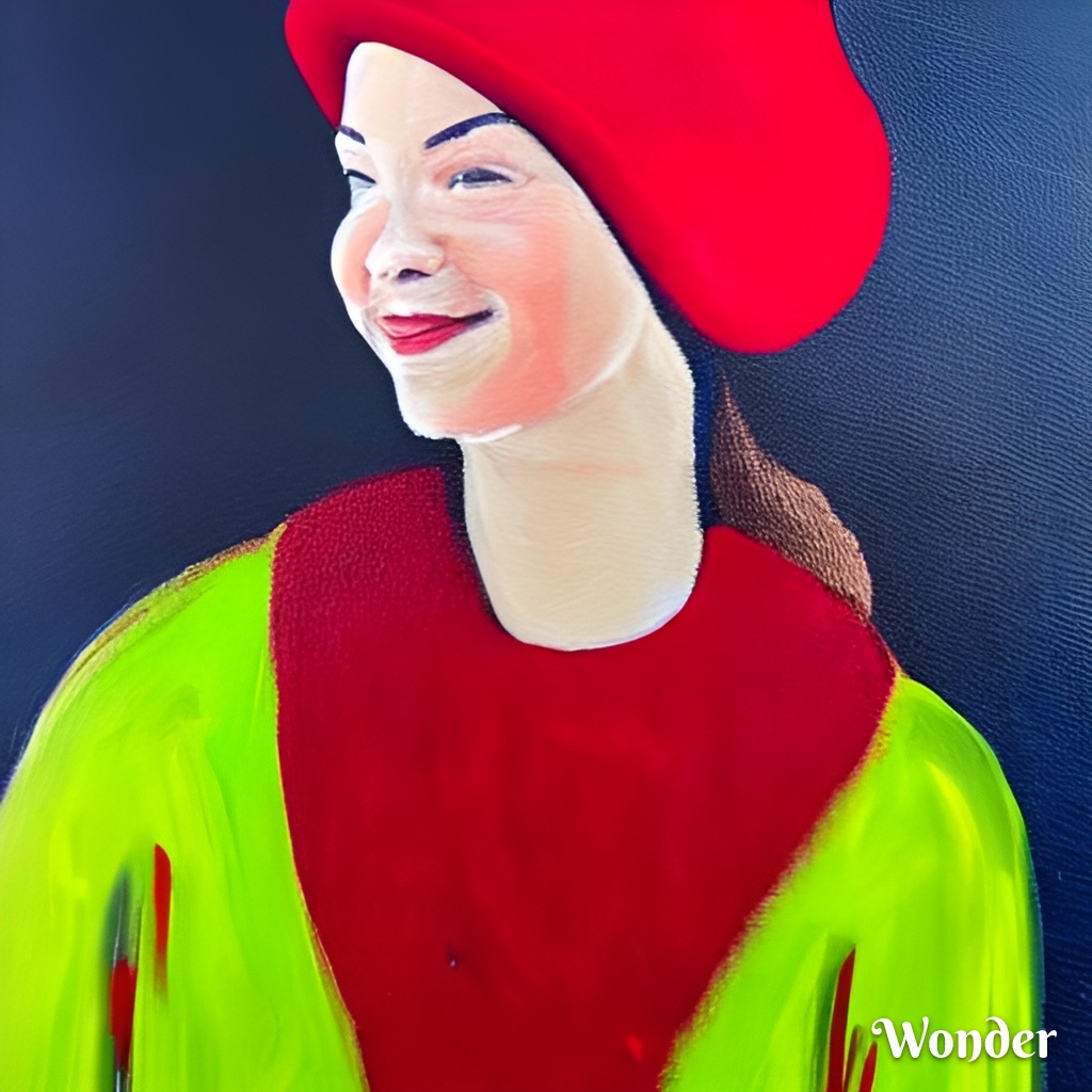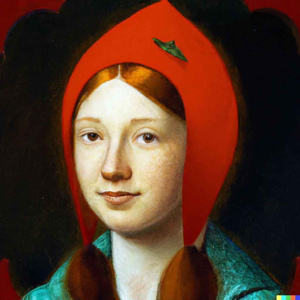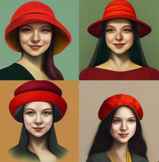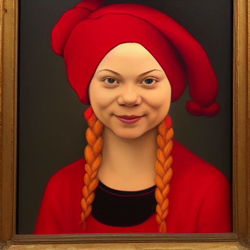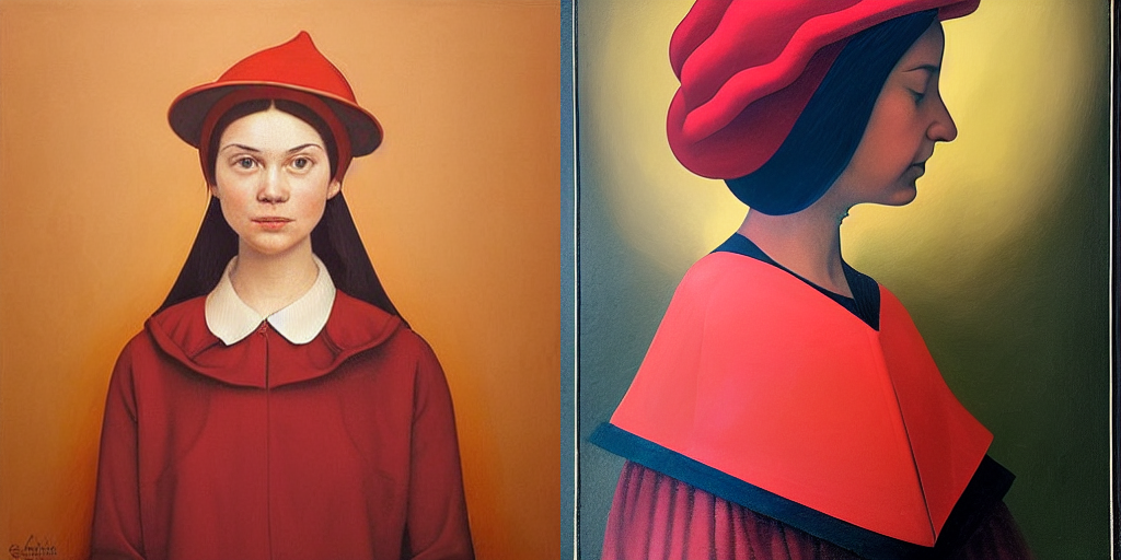 Zkusil jsem jako vstup obraz, co jsem před pár měsíci vygeneroval přes DALL-E – „Dívka s červenou čepičkou“. Tento model vytvořil prompt: „a painting of a woman wearing a red hat, inspired by Ambrosius Benson, behance contest winner, she is a gourd, greta thunberg smiling, dating app icon, 1970s female alive, two pointed ears, rosetti, daz3d, beets, okuda, ingres“.