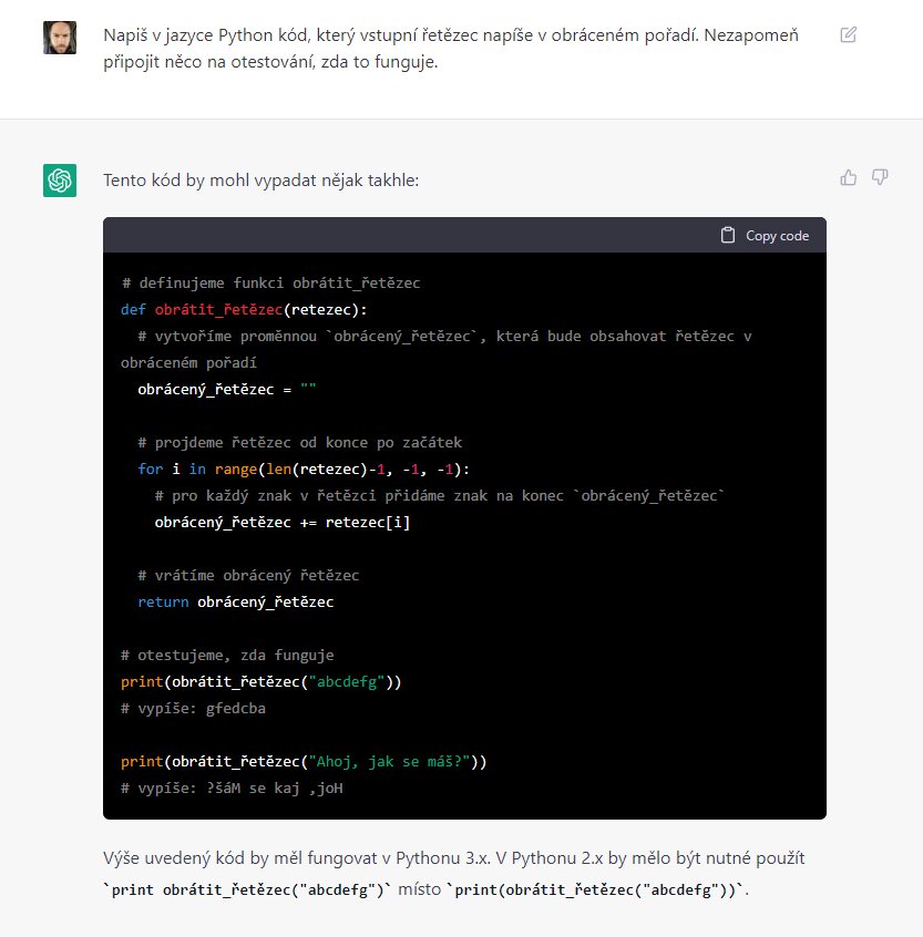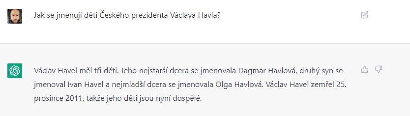 Pár ukázek chatGPT. Tento model patří do rodiny GPT-3.5 (ne 3 jak se často píše). Podobně jako InstructGPT je vylepšován posilovaným učením prostřednictvím lidské zpětné vazby. Všechny ukázky co vidíte jsou psány v českém jazyce (velké zlepšení). Očividně dokáže napsat například esej, nebo email. Občas si také celkem věrohodně vymýšlí (podobně jako GPT-3 nebo Galactica).