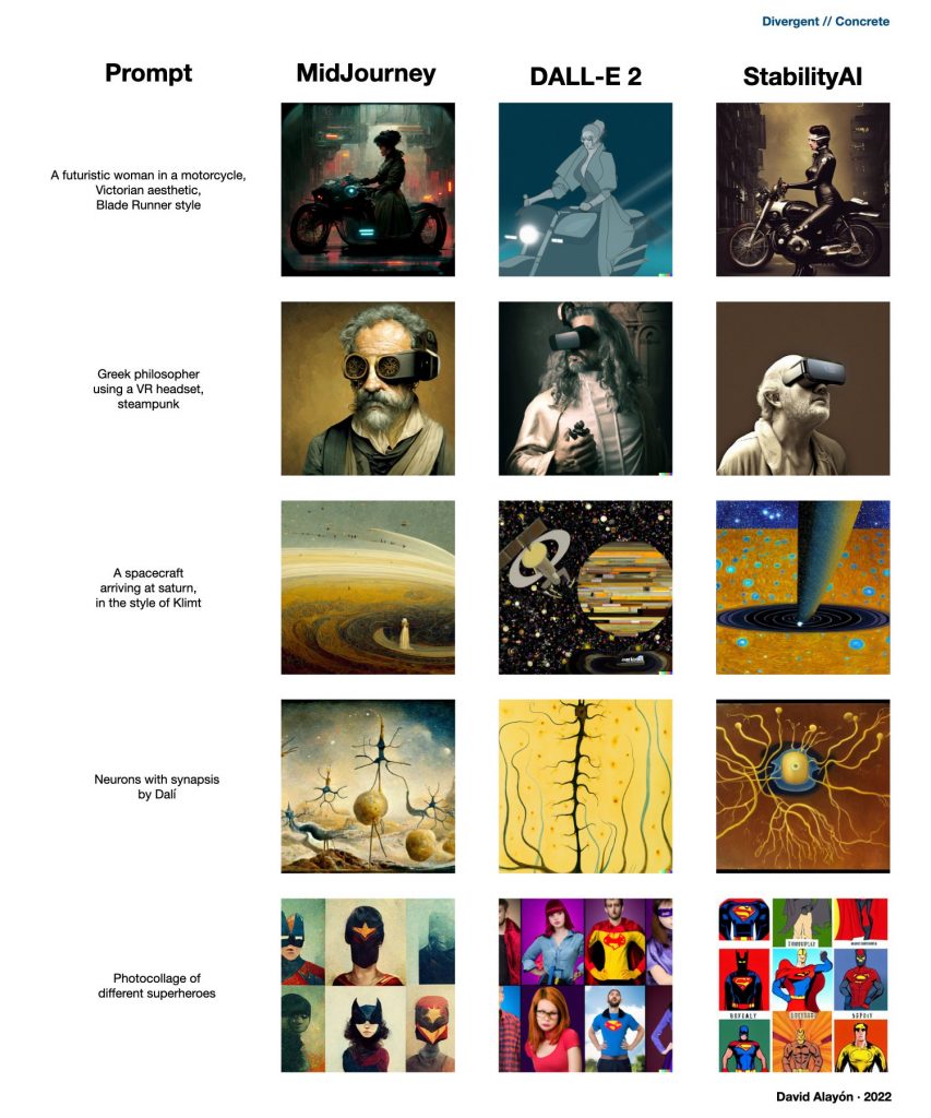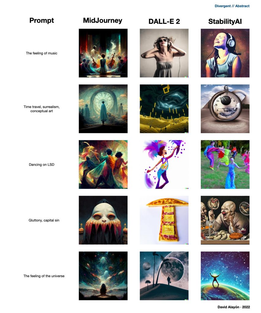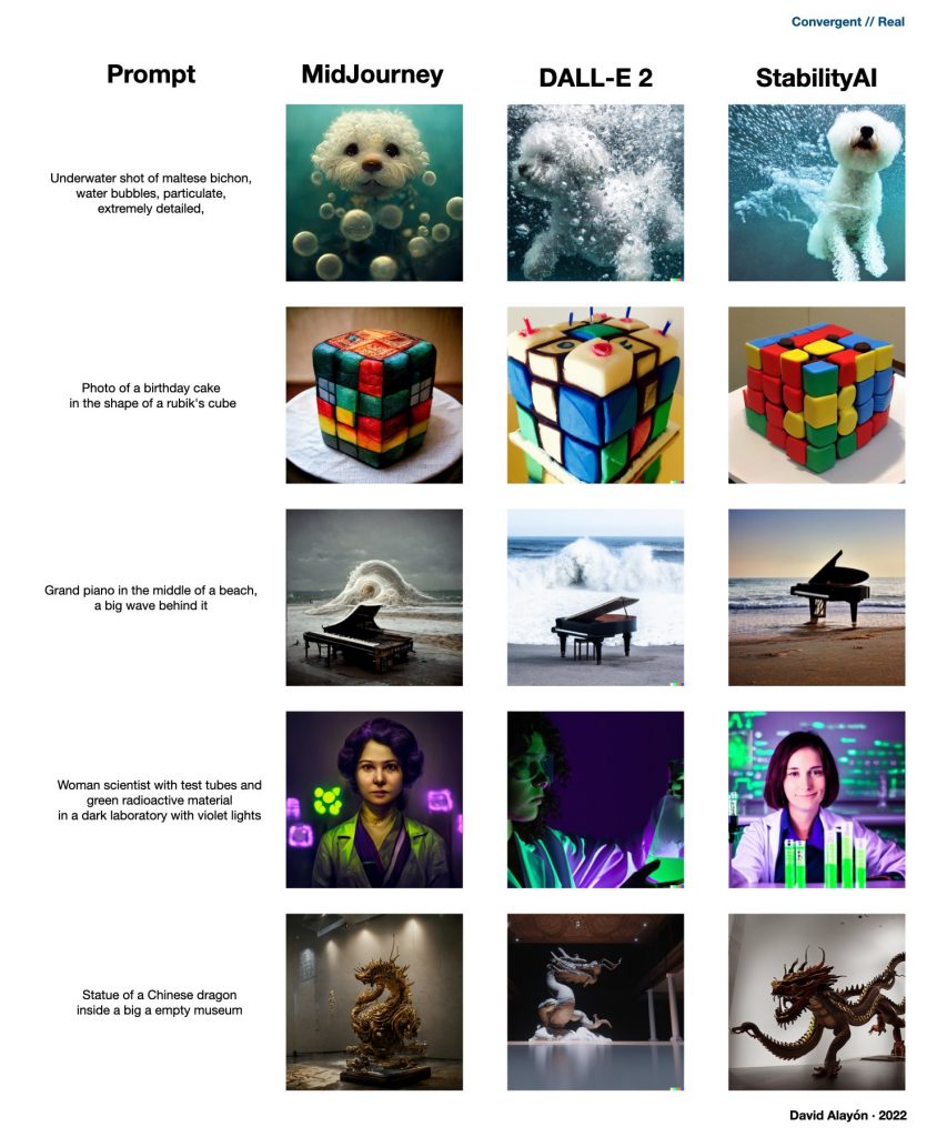 ? Attached you have a comparison of MidJourney, DALL-E 2 and StabilityAI (in this last one I have used the k_lms sampler, I will explain later). I have divided it into two areas, Convergent (when we ask the AI something with a lot of detail and specifications) and Divergent (when we give it very few guidelines and let it explore). These in turn are divided into two: